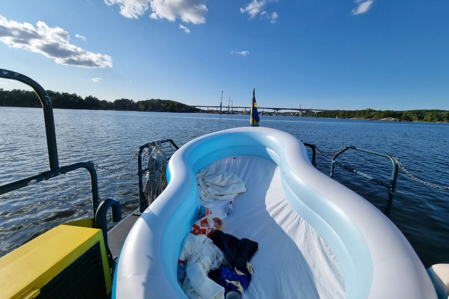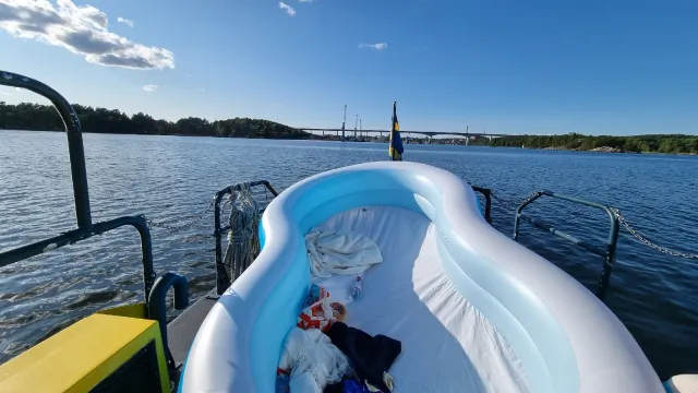 På väg hem efter patrull blir vi invinkad av en segelbåt. Han hade för en stund sedan passerat en uppblåsbar "pool" med två barn i. "Poolen" var på väg ut i farleden och barnen kämpade med att paddla mot vinden. Segelbåten hade tänkt vända då vi dök upp. Vi möter upp barnen i sin pool och får bekräftelse på att dom mot sin vilja driver utåt från land. Dom hade sökt upp vårt telefonnummer och var på väg att ringa. Vi tog ombord barn och pool och körde in dom till land igen.