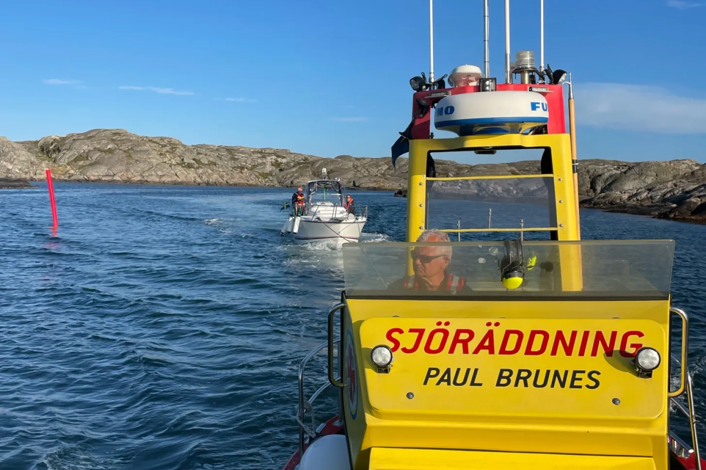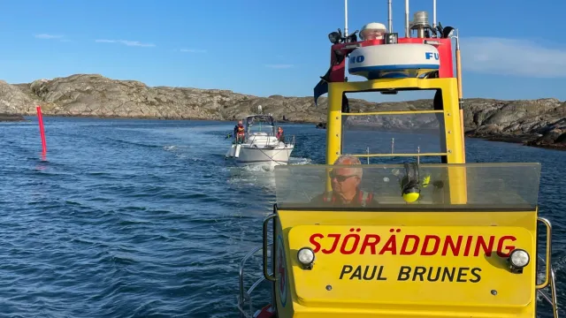 Båt med vatteninträngning efter grundkänning. Frivilliga sjöräddare ombord på Rescue Margareta Emblad och Rescue Paul Brunes hjälper med länspumpning och bogsering till kaj för lyft.
