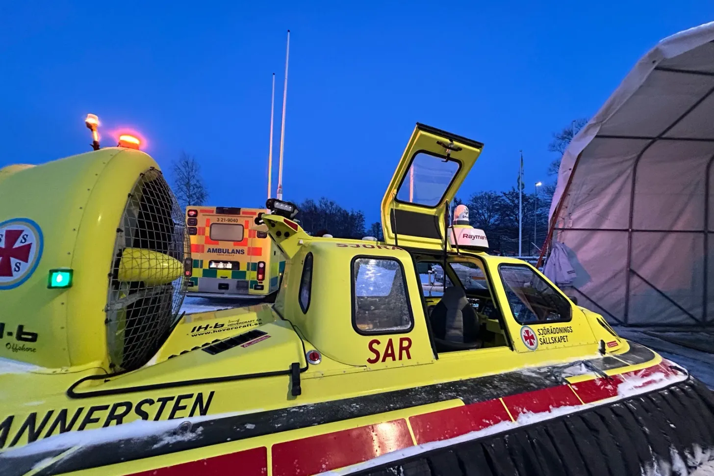 Vi har precis kommit tillbaka till räddningsstationen när larmet går. En skrinnare har fallit på isen och brutit benet. Vi inväntar ambulanspersonal som följer med i svävaren ut till skadeplatsen. På plats får patienten smärtlindring och benet stabiliseras innan denne flyttas till bår och transporteras tillbaka till den väntande ambulansen.