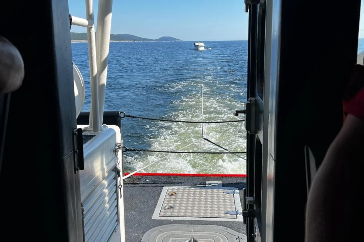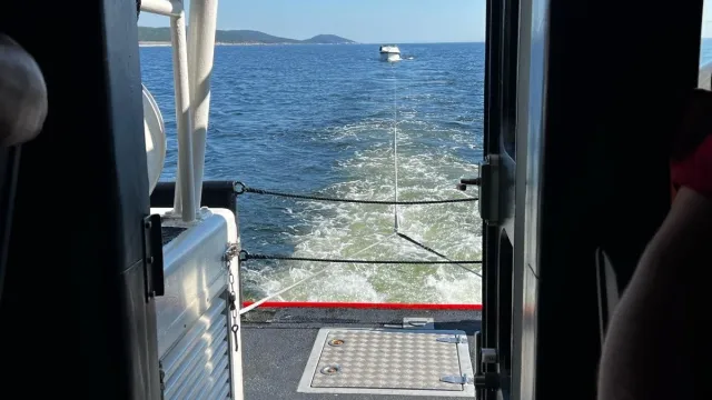 Motorbåt som haft grundkänning och skadat drevet och blivit manöveroduglig. Vi bogserar till hemmahamnen.