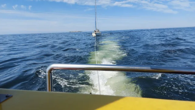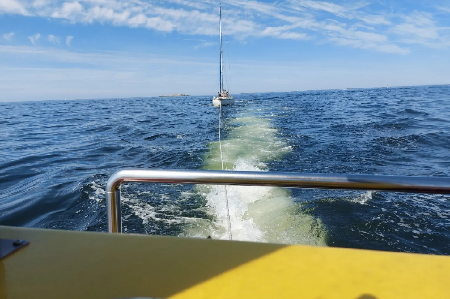Vackra dagar kan ofta betyda svaga vindar. En segelbåt som hade bränslebrist eskorterades och bogserades in till Skärhamn. Dunkar med diesel inhandlades och en mycket tacksam medlem kunde sedan vinkas av när man gick vidare mot Göteborg.