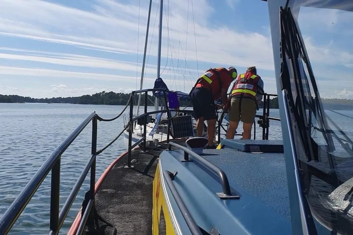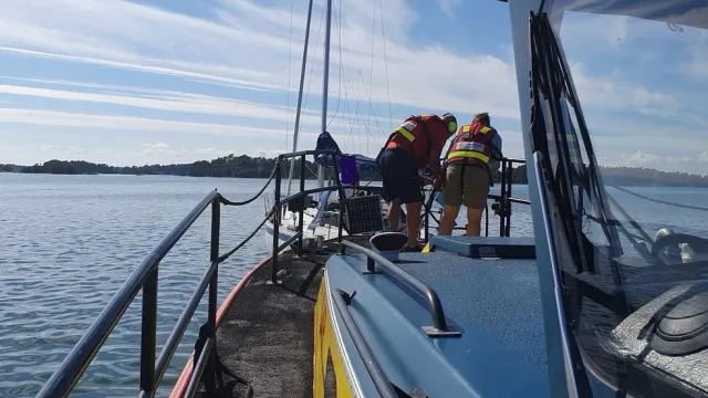 Söndag 15.05 får vi larm om att en medlem sitter fast efter att ha gått på grund med sin tio meter långa segelbåt i höjd med Kallsö. På plats kopplar vi en bogsertamp till segelbåtens aktersta pollare och drar lätt med Rescue Ingegerd Ramstedt. Segelbåten glider av grundet och kan fortsätta för egen maskin.