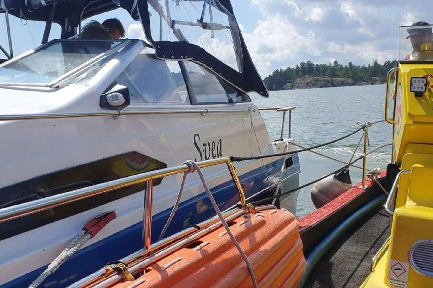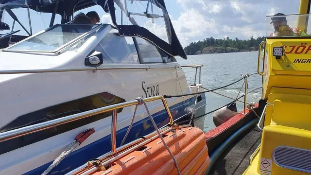 Vi fick ytterligare ett samtal från medlemscentralen på fredagen. Den här gången gällde det en motorbåt som fått bränslebrist. Väl framme på positionen visade det sig att det fanns en del bensin i kölen. Vi rekommenderade att medlemmen inte skulle starta båten utan bogserade den till Uvmarö.