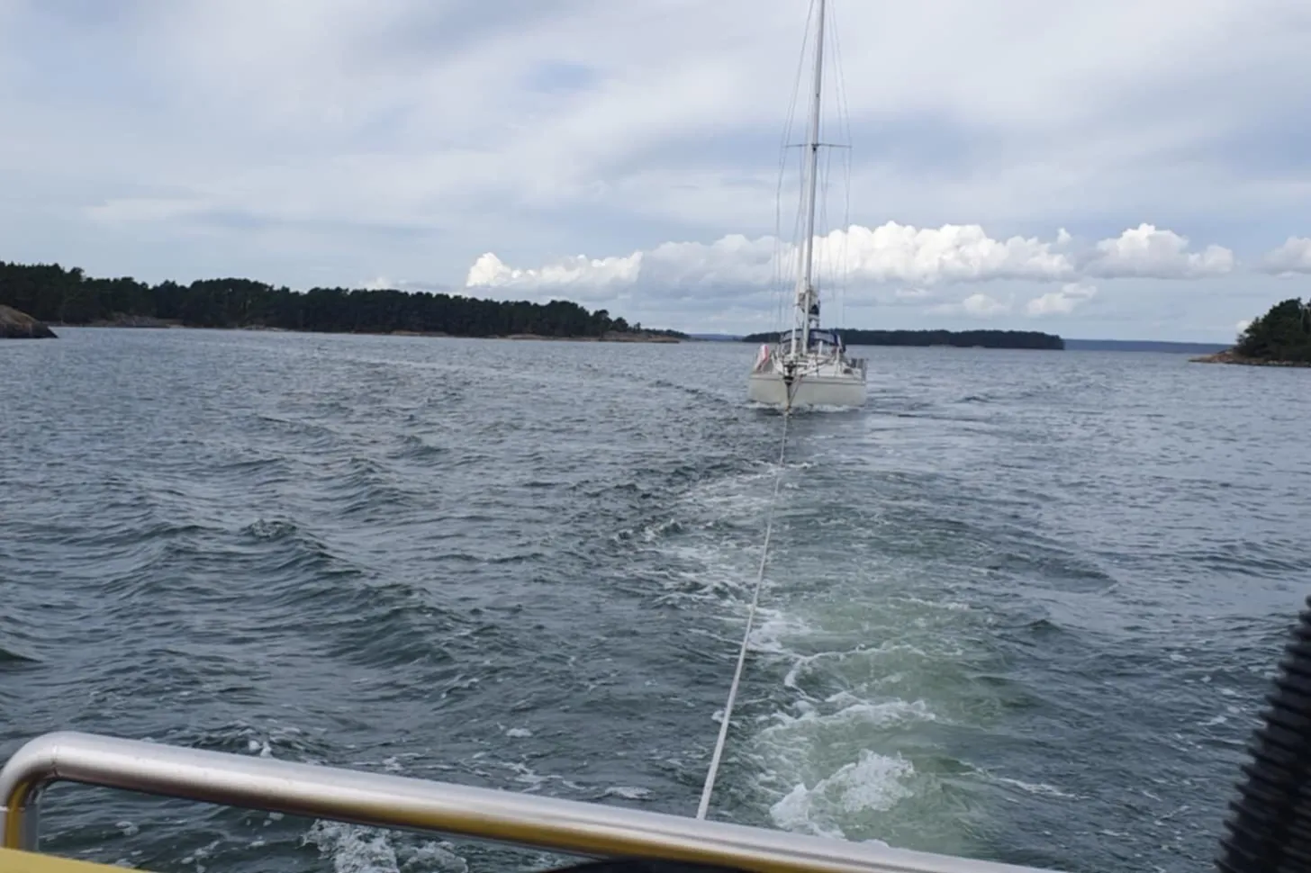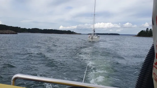Under måndagsförmiddagen får vi larm om att en segelbåt drabbats av maskinproblem norr om Arkösund. Båten behöver bogseras till ett varv för åtgärd. Vi kopplar upp med Ingrid af Slättö och bogserar segelbåten till Arkösund för att sedan tacka för oss och återgå till vår hemmahamn.