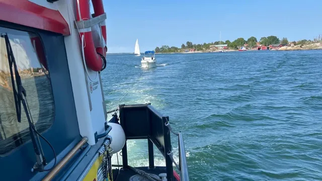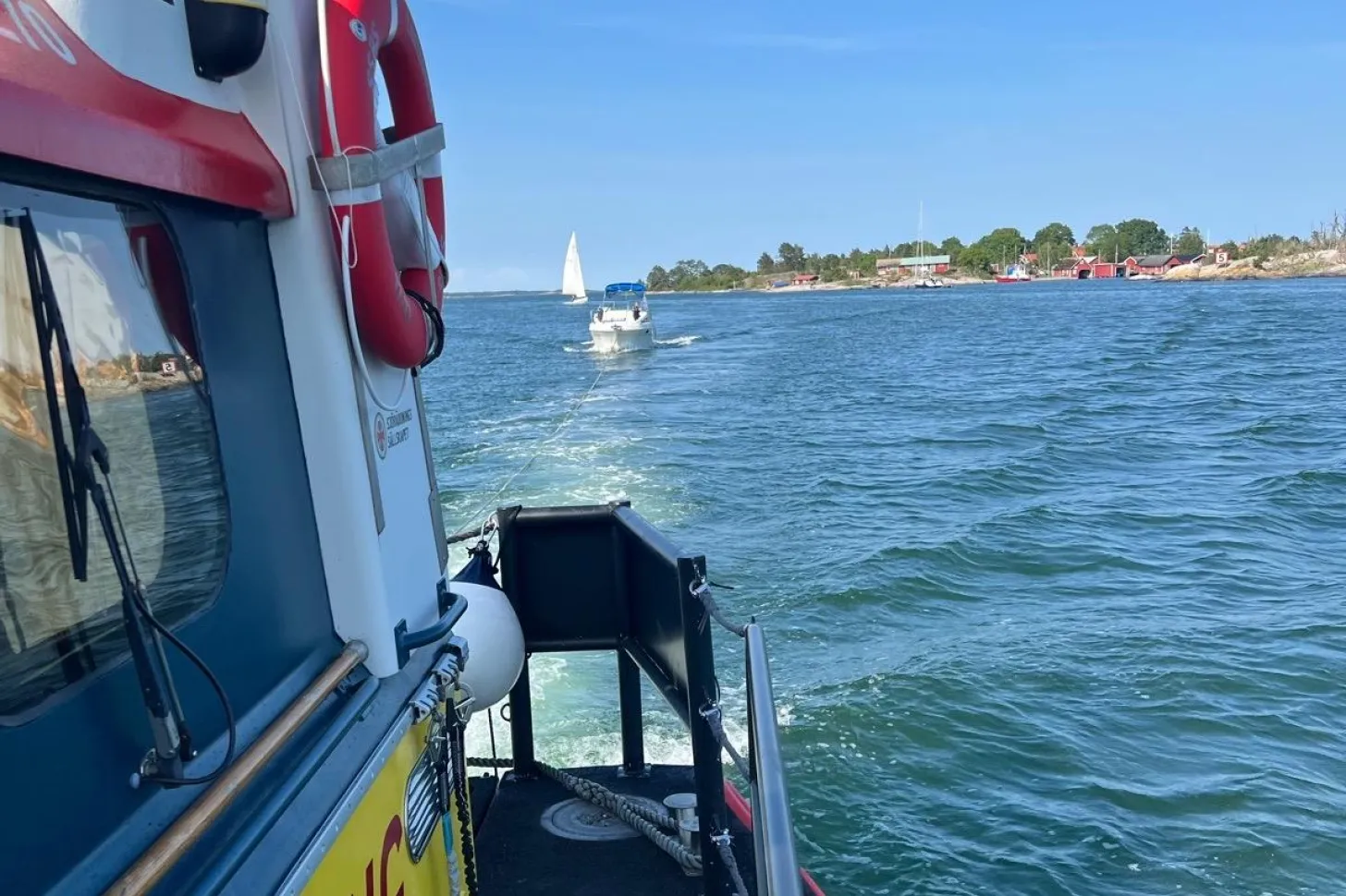 Medlem som kört över grund och skadat propeller och drev. Vi bogserar till Marina i Loftahammar.