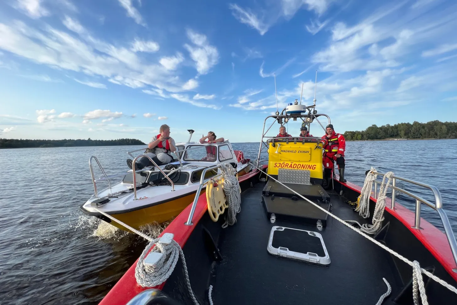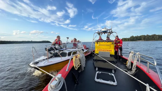 Söndag eftermiddag ringer telefonen och två personer har gått på grund så kraftigt att motorn har gått sönder. Vi åker mot Lövholmen och plockar upp båten med 2 personer ombord och drar dem till hemmahamnen i Karlholm.