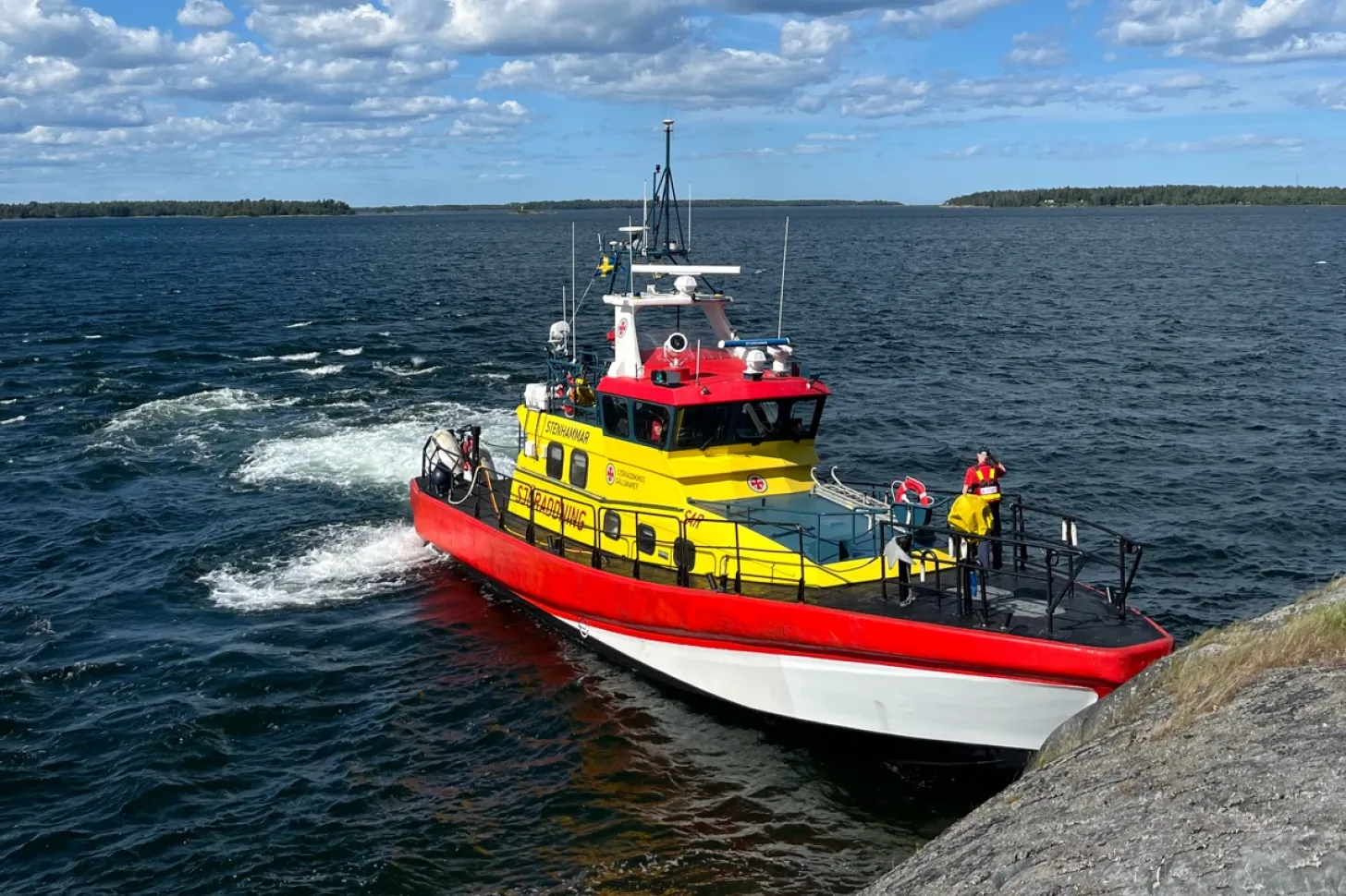 Under pågående övning observerar vi en båt som slår mot land vid Tjockö/Tunnholmen med två personer ombord. Vi går omgående mot platsen med Rescue Stenhammar. Väl framme tar vi ombord de två personerna, som mår bra. En sjöräddare går iland och ror ut båten, som vi därefter kopplar för bogsering till säker hamn. Allt väl.