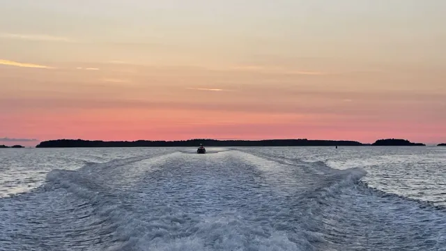 Larm om  från SOS om en skadad man på en ö. Vi går med bägge båtarna och ambulans medföljer på Greta Dybeck. Magnhild Ekman är med som backup utifall Greta Dybeck inte kan gå ända fram. När larmet kommer är det mörkt, men när vi åker tillbaka med patienten och en anhörig börjar solen gå upp.