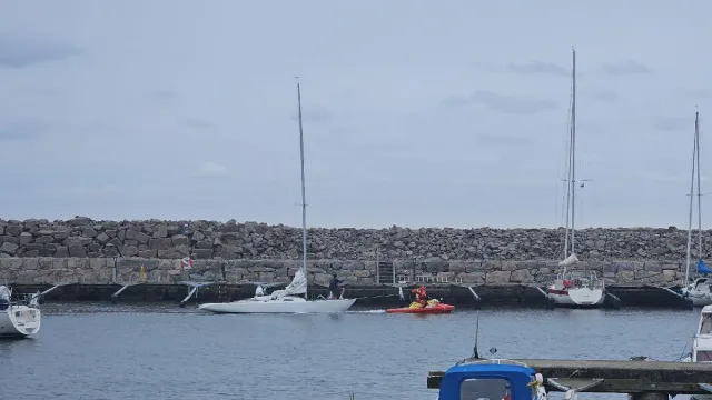 Segelbåt på väg in mot Grötviks hamn tappar motorn strax utanför hamnen. Besättningen gör två försök att segla in i hamnhålet men med motvind så räcker inte farten och de håller sig i en styrbordsprick i väntan på hjälp. Vi var redan på stationen, så vi tog vattenskotern ut och drog in båten till sin ordinarie plats. Räddningsdykare som övade bärplan övningssökte efter motorn men den blev kvar på botten.