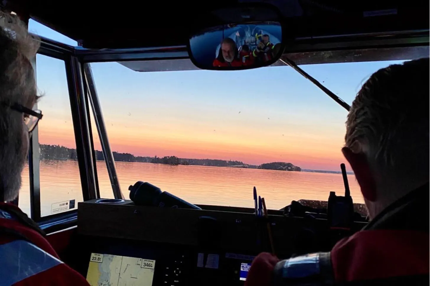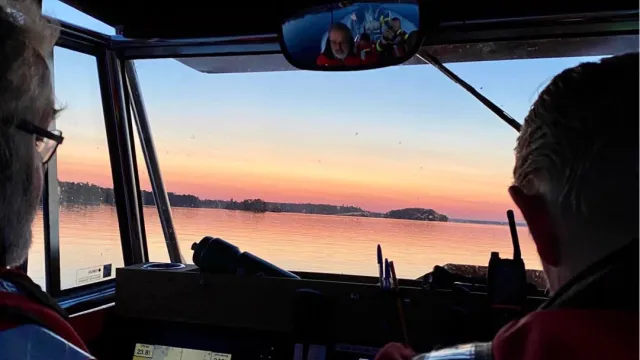 Strax efter 10 på tisdagskvällen ringer vår jourtelefon. En medlem har motortrubbel och kommer inte hem. De ligger strax norr om Bockholmen och vi hjälper till med bogsering till Araby brygga. En fantastisk solnedgång fick vi se under resan.