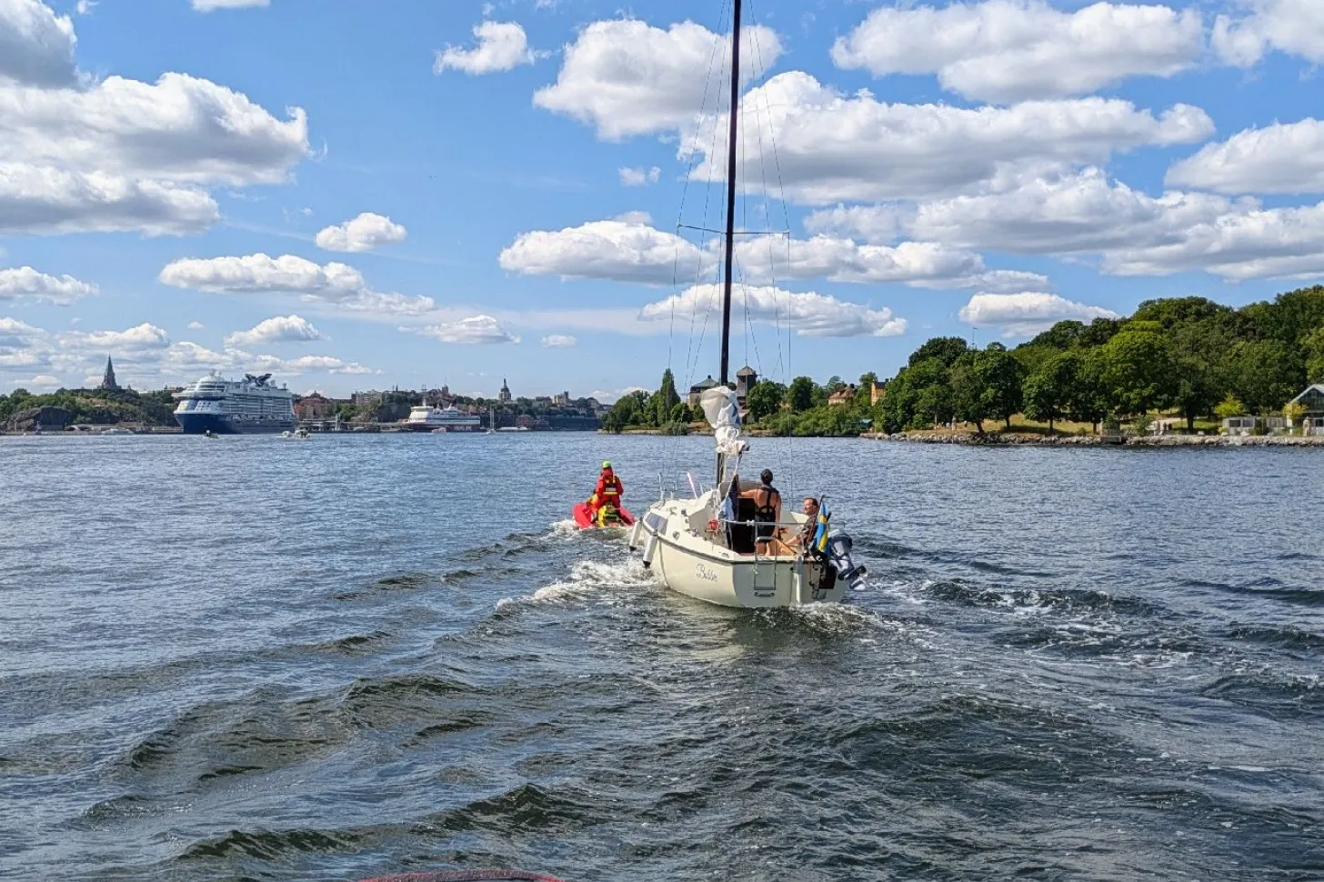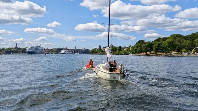 En Maxi 77 fick motorstopp och fick initialt hjälp av civila att ta sig in till Vikingarnas hamn på östra Djurgården. Vi hjälpte därefter med den sista sträckan till Vasahamnen – först med Rescuerunner Björn Sjökvist och därefter den avslutande biten med Rescue KREAB.