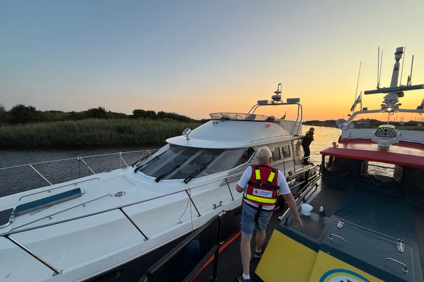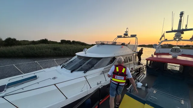 Strax innan 21.00 fick en fritidsbåt problem i inloppet till Skäldervikens hamn efter att ett okänt föremål fastnade i propellern och gjorde båten oduglig att manövrera. Besättningen tvingades nödankra och begärde hjälp via medlemscentralen. Fyra frivilliga sjöräddare bemannade Rescue Gripen och ryckte ut, kopplade upp båten och assisterade in till servicekajen i Skäldervikens hamn.
