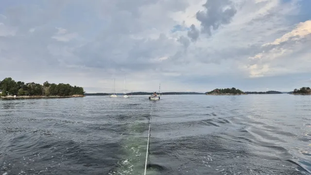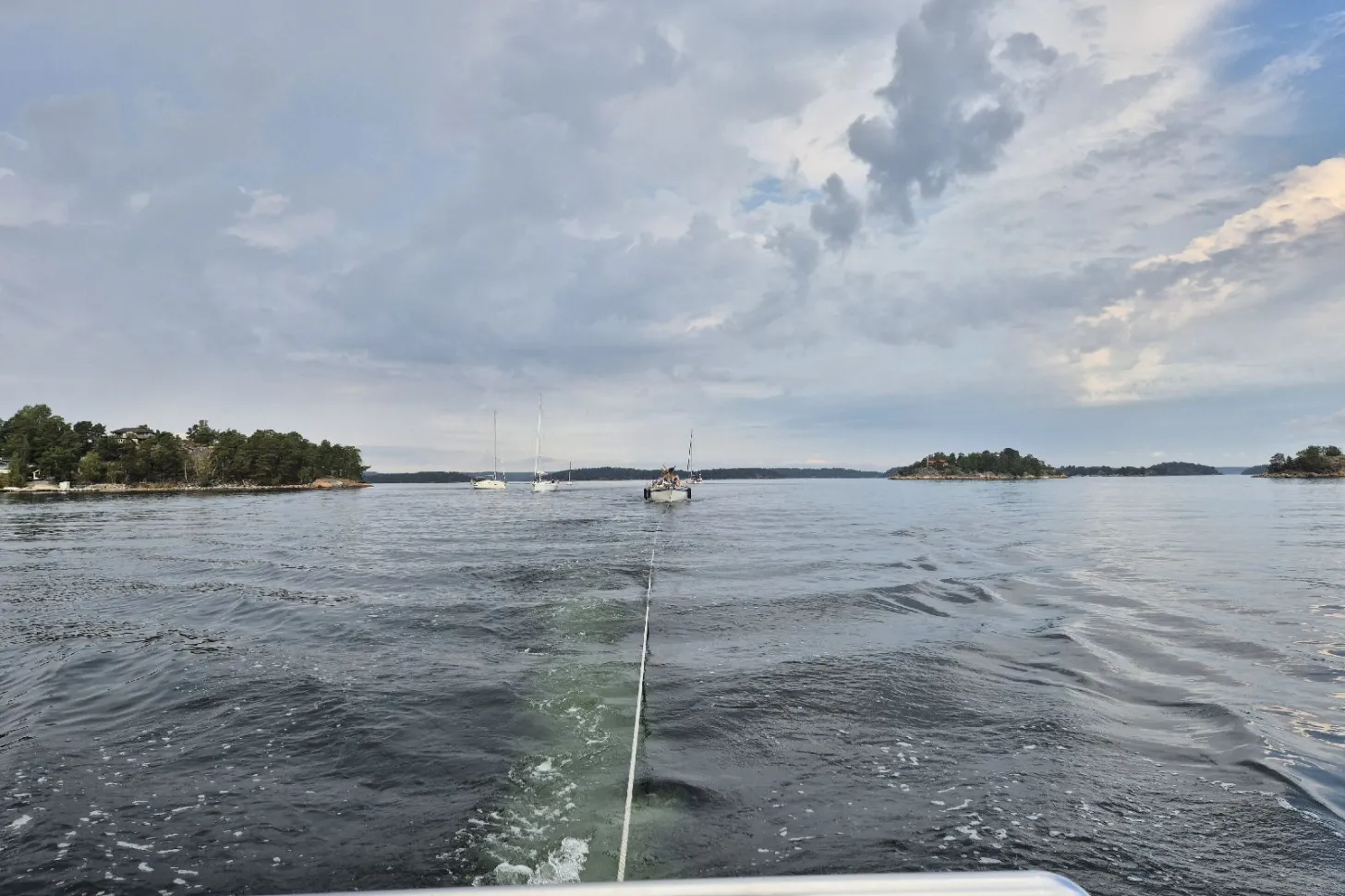På väg med starthjälp utanför Nämndö såg vi en segelbåt som låg och drev på fjärden. Paret ombord hade köpt båten dagen innan och var på väg att ta den långa transporten till Västerås. Problem med kylvattnet gjorde att motorn gick varm. Av ren tur passerade vi och frågade om de behövde hjälp. Vi bogserade dem till säker hamn.