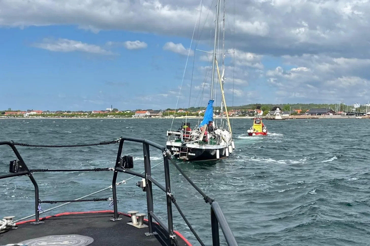 Torsdag kl. 12.16 inkommer samtal från medlemscentralen om en 42-fots segelbåt med både roder- och motorhaveri som driver utanför Helsingborg. Frisk nordvästlig vind med grov sjö och kraftig sydgående ström gör det svårt för oss att assister. Vi kopplar för bogsering med Rescue Ulla-Karin och kopplar Rescue Ulla Brita Andersson i haveristens akter för att styra. Bogserar till Råå hamn och lyckas tillsammans lägga henne tryggt vid kaj.