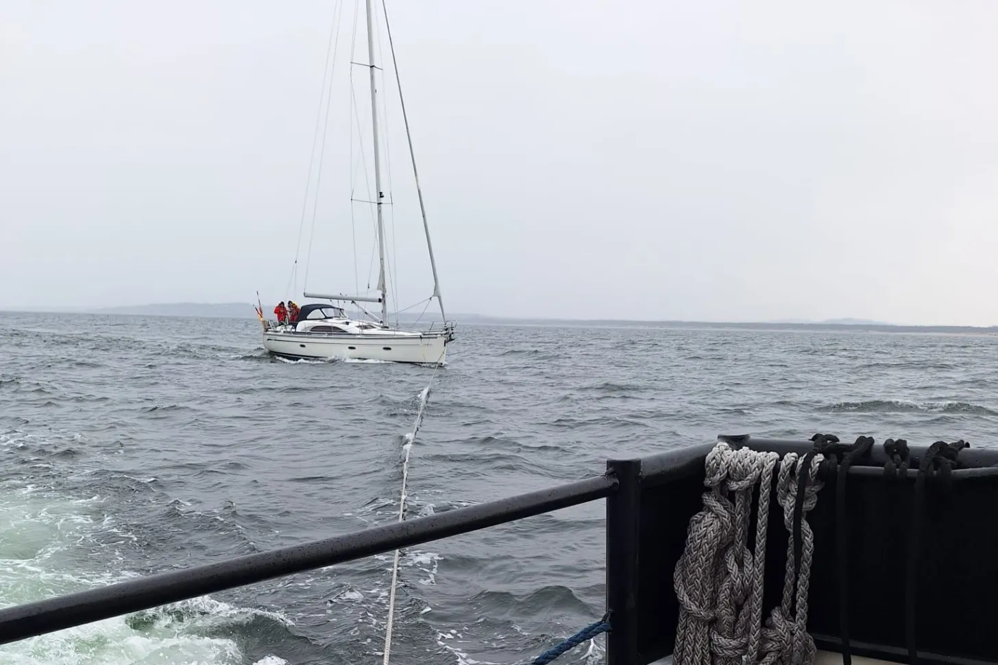 En 40-fots segelbåt med roderhaveri, 3 personer ombord. Rodret hade fastnat dikt babord så det blev en knepig bogsering i början innan dom lyckades vrida rodret rätt.