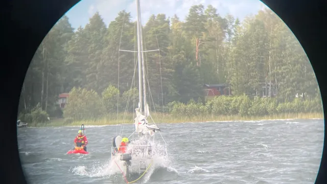 Samtal från en privatperson som meddelar att man hamnat i en dålig situation med sin segelbåt. Man har drivit in i ett grundområde och hugger mot botten i den friska vinden. Avgår skyndsamt med Rescue Vialla. Väl framme sjösätter vi Rescuerunner Todlas med två sjöräddare. Sätter ombord en sjöräddare för att kolla läget ombord och bistå vid lossdragning. Man har under tiden försökt simma ut med ankare för att försöka hålla båten från land. Todlas kör in bogserlinan och lossdragning påbörjas. Allt går väl och vi bogserar in dem till Bromskär där de kan få lite lugn och ro. Återgår mot Räfsnäs.