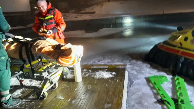 Larm om en prio 1 sjuktransport inkommer kl. 00.46. Vi hämtar upp ambulanspersonalen vid Gräsvik BTH brygga och kör sedan ut till Aspö och angör enligt överenskommelse med SOS. Isläget gör att vi väljer färjelägret. Patienten lastas liggande i svävaren, som behandlas av ambulanspersonalen under färden in till Gräsvik och mot ambulansen för vidare transport. Kl 04.00 är vi klara och lämnar vår tillfälliga svävarbas på Arnö.