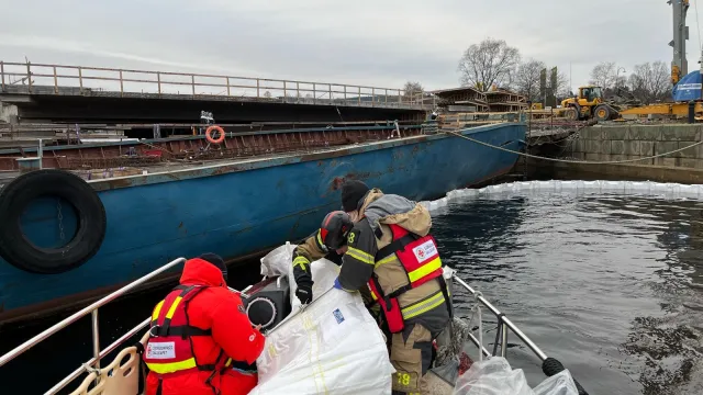 Räddningstjänsten ringer och vill ha assistans med utläggning av länsar, vi bemannar Rescue SXK Västkustkretsen och hjälper till att lägga ut dessa tvärs kanalen.