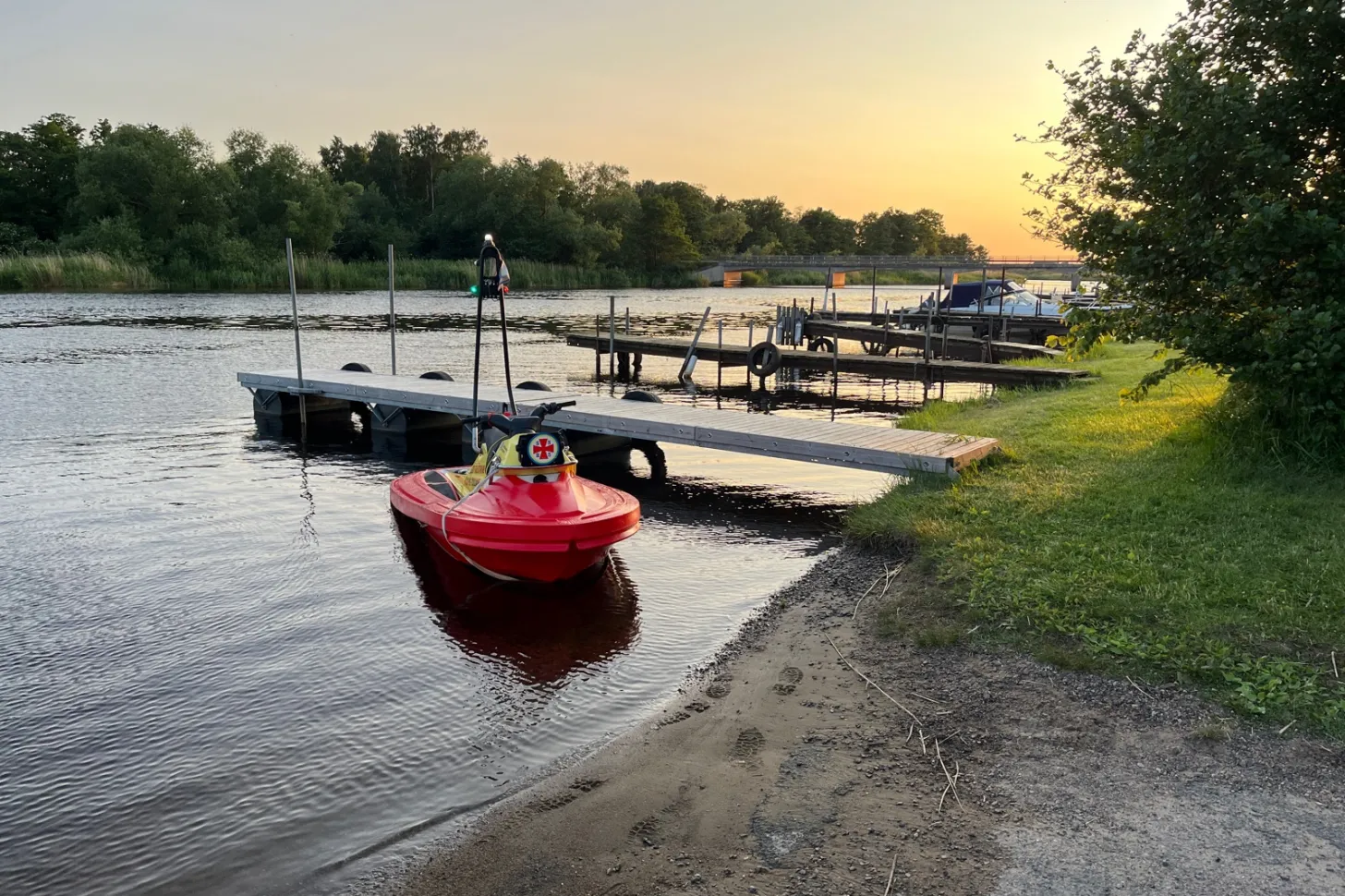 RS Åhus blir utkallade av SOS-Medlemscentralen gällande båt med överhettad motor cirka 2 sjömil uppströms Helge ås mynning i havet. Vi går ut med vår räddningsskoter Rescue Käthe-Juliane och tar båten på släp till upptagningsrampen i Yngsjö. Efter uppdraget återgår vi i solnedgången till Åhus.